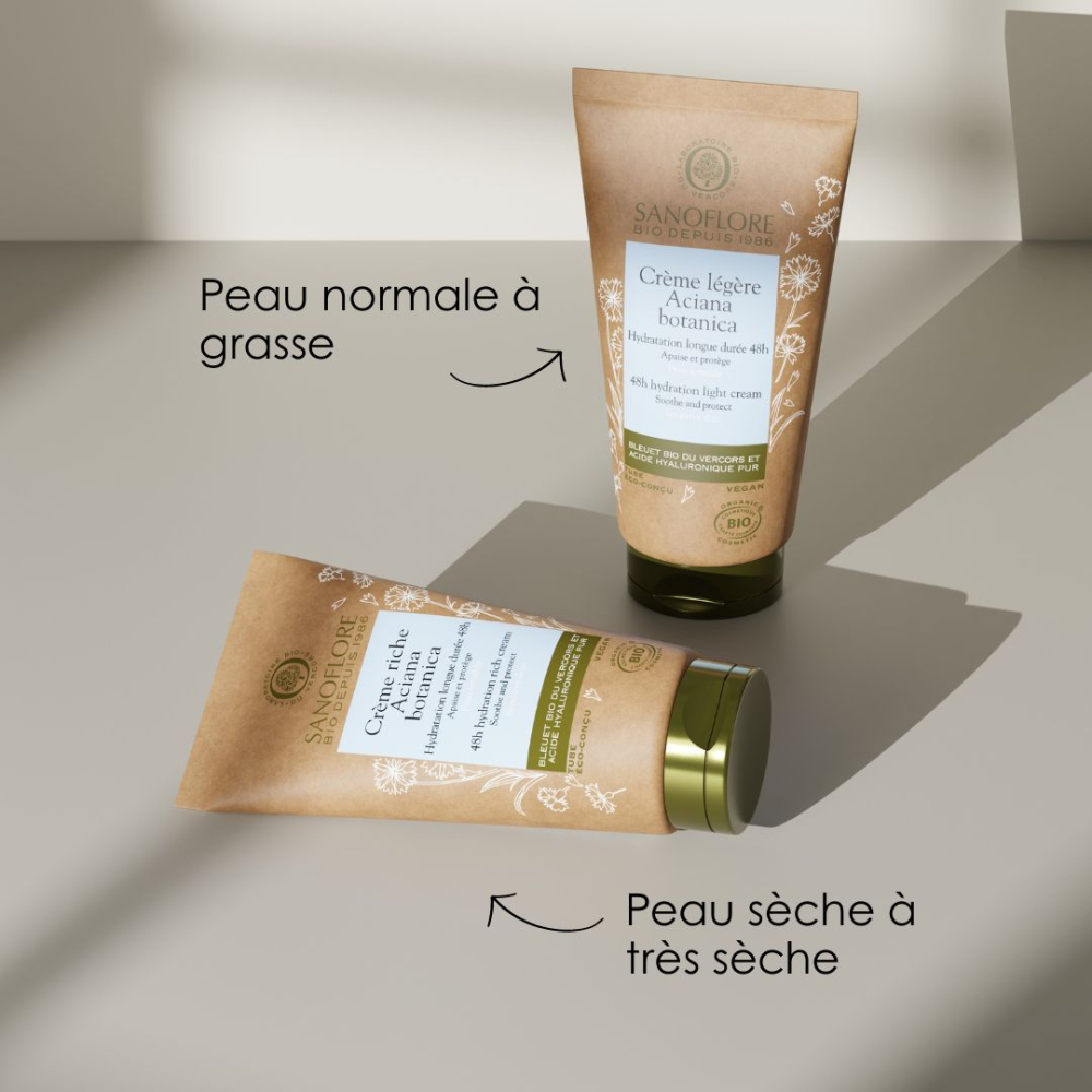 La crème riche Aciana Botanica contient 99 % d’ingrédients d’origine naturelle sélectionnés par les laboratoires Sanoflore pour leur tolérance sur les peaux sensibles. Elle est formulée avec un complexe d’actifs hautement hydratants et apaisants, comportant de l’eau de Bleuet bio du Vercors antioxydante, fortifiante et anti-inflammatoire, de l’acide hyaluronique d’origine naturelle hydratant et repulpant, de l'aloe vera aux propriétés hydratantes, apaisantes, cicatrisantes et régénérantes, et du beurre de Karité nourrissant et protecteur.