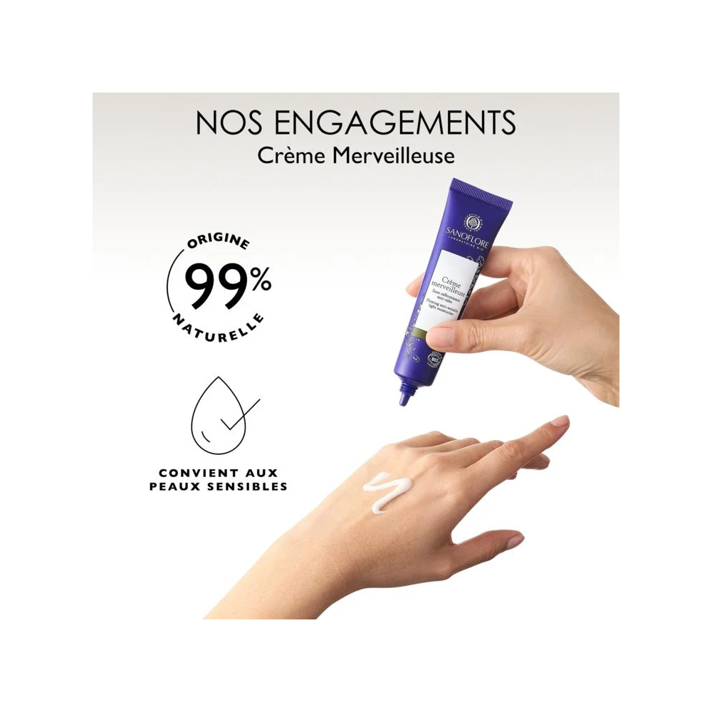 La Crème Merveilleuse Légère est une crème de jour certifiée bio conseillée pour les peaux en manque de fermeté et marquée.
