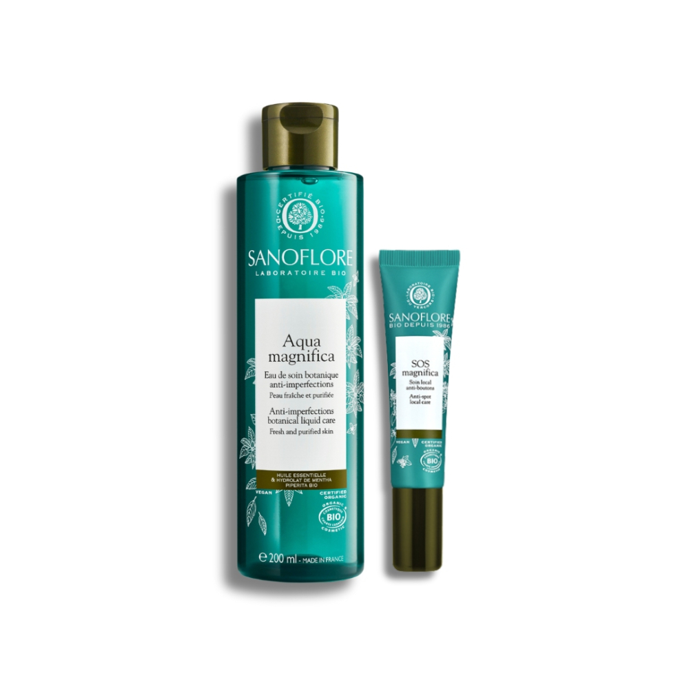 Vegan* et formulés à 99 % d’ingrédients d’origine naturelle, le soin stop bouton SOS Magnifica et l'Aqua Magnifica contiennent le complexe de 9 huiles essentielles bio Magnifica Sanoflore breveté aux vertus antibactériennes et anti-inflammatoires. Elles neutralisent les bactéries responsables des boutons rouges, empêchant ainsi leur prolifération, purifient la peau et calment l’inflammation.