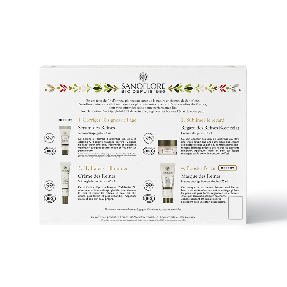 La Crème des Reines légère est composé d'Edelweiss bio, qui stimule la production de collagène (test in vitro sur l'actif), de l'Acide Hyaluronique pour une hydratation optimale, et du Thym Orange Bio du Vercors aux propriétés anti-âge (test in vitro sur l'actif).