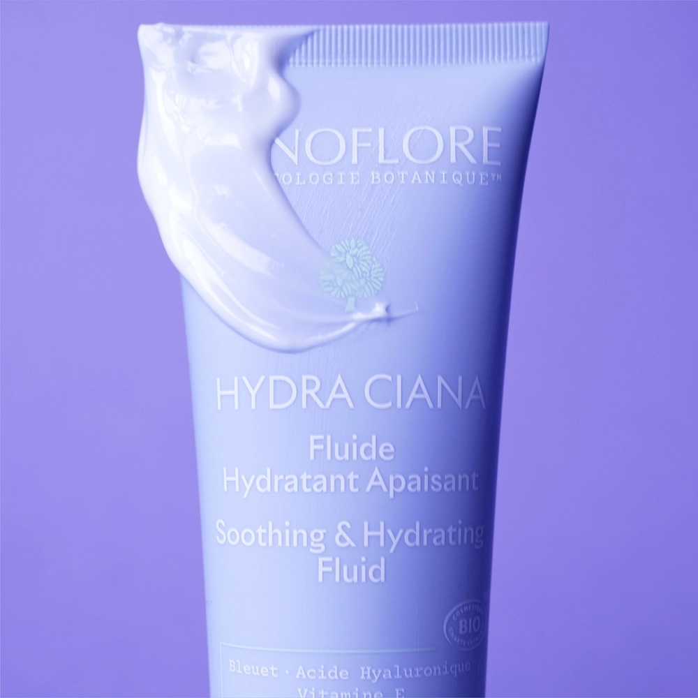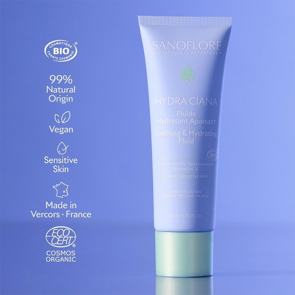 Le Fuide Hydratant Apaisant HYDRA CIANA est un soin vegan formulé à 99 % d’ingrédients d’origine naturelle.