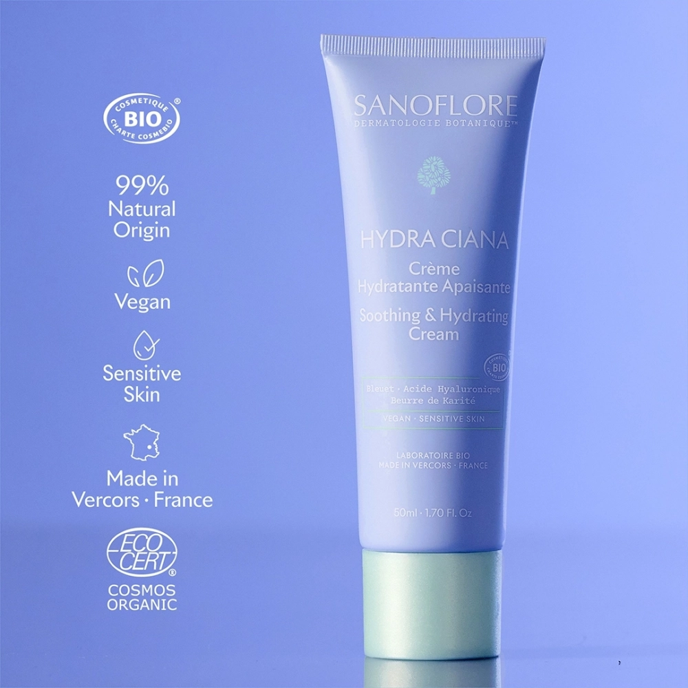 La Crème Hydratante Apaisante HYDRA CIANA est un soin vegan formulé à 99 % d’ingrédients d’origine naturelle.