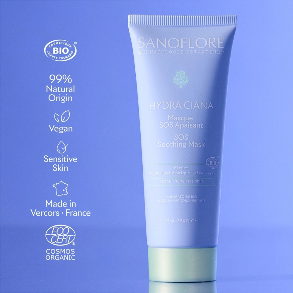 Le Masque SOS Apaisant HYDRA CIANA est un soin vegan formulé à 99 % d’ingrédients d’origine naturelle.