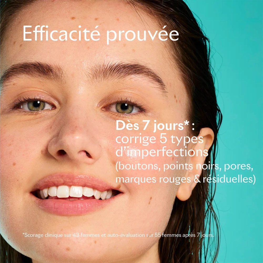 Dès 7 jours¹: Corrige 5 types d'imperfections (boutons, points noirs, pores, marques rouges & résiduelles)