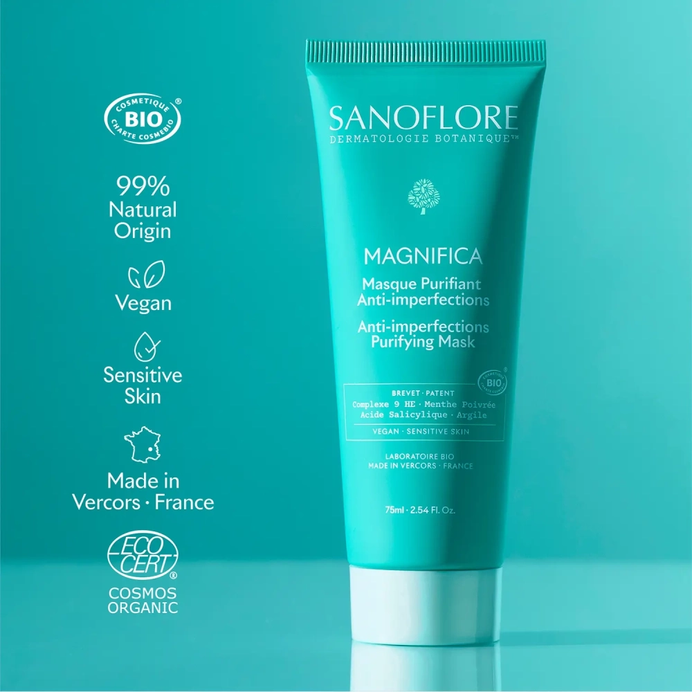Le complexe Magnifica breveté, association de 9 huiles essentielles bio, est développé pour contribuer à une peau d’apparence plus nette et uniforme.