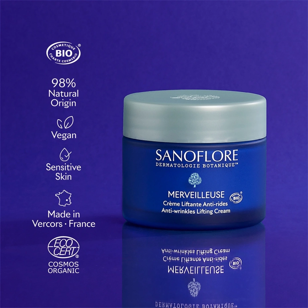 La Crème merveilleuse Riche est un soin de jour anti-rides intégral certifié bio, composé à 98% d’ingrédients d’origine naturelle.