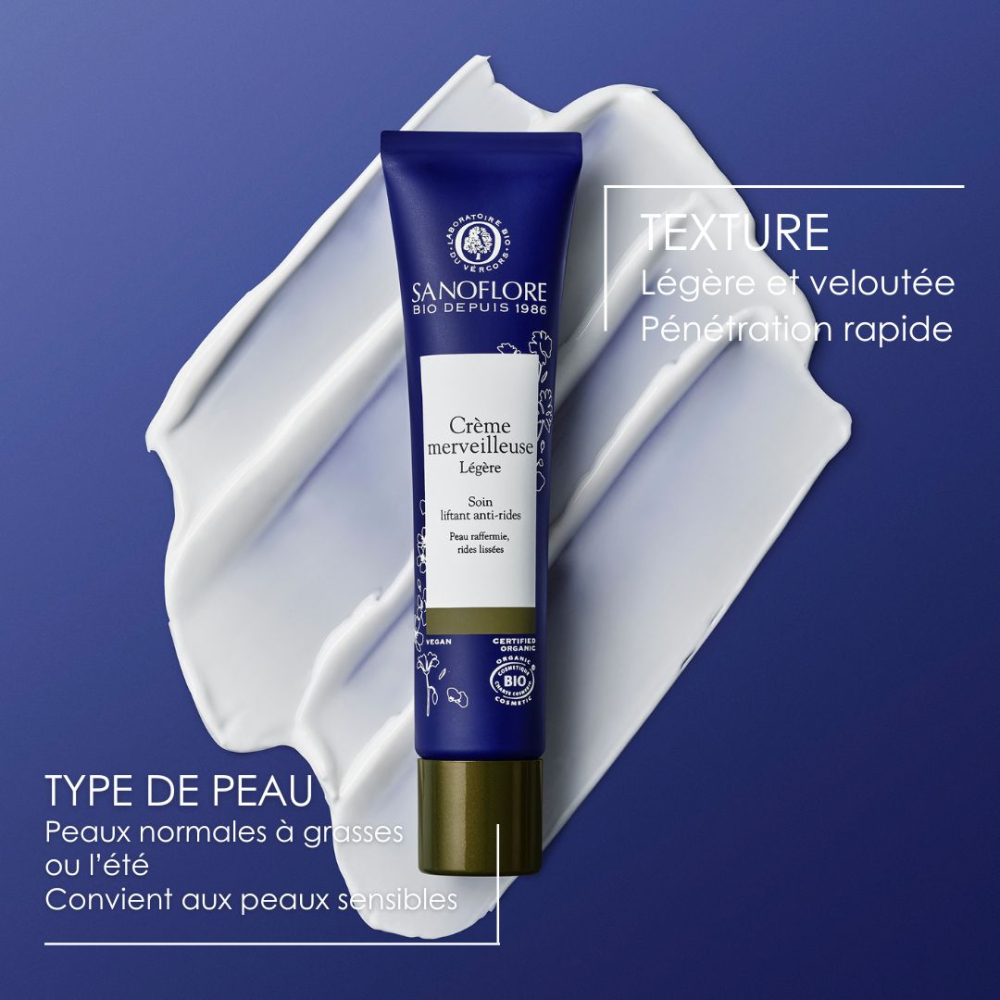 La nouvelle Crème Merveilleuse légère est le 1er rétinol végétal* certifié bio qui booste 7 types de collagènes pour agir sur les rides, ridules et fermeté !